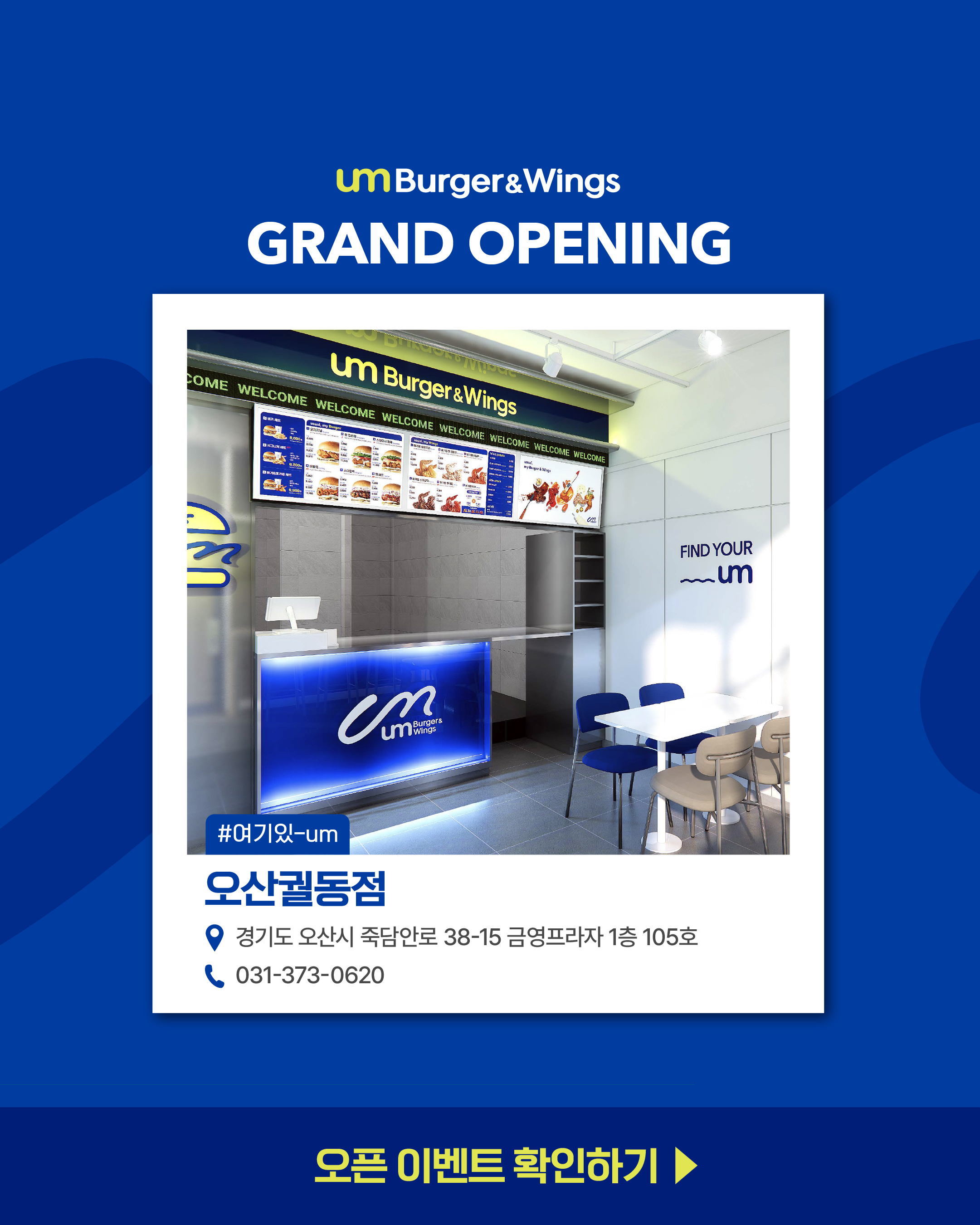 ✅ 매장명: 움버거앤윙스 오산궐동점✅ 매장주소: 경기도 오산시 죽담안로 38-15 금영프라자 1층 105호✅ 매장번호: 031-373-0620